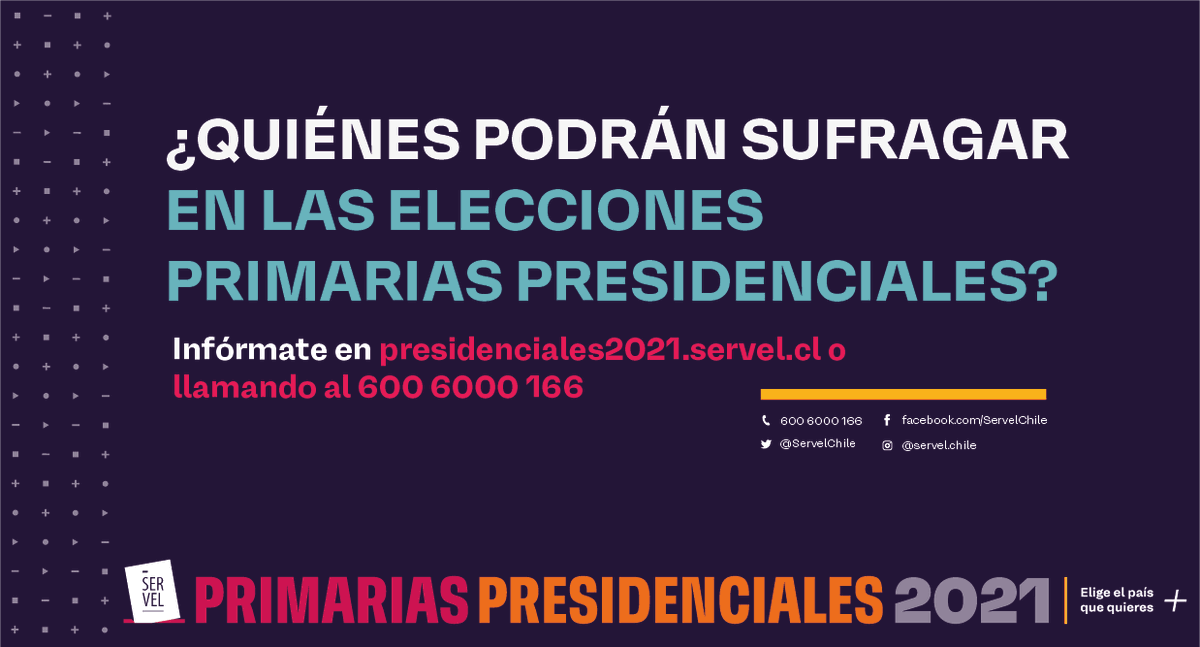 Nómina de electores que no serán considerados en padrón electoral julio 12, 2021 san ramón: Servel publica facsÃmiles de cédulas electorales para las primarias presidenciales julio 13, 2021 noviembre: Las primarias presidenciales de apruebo dignidad de 2021 serán el método de elección del candidato presidencial de chile de los partidos comunista, revolución democrática, convergencia social, comunes y federación regionalista verde social para la elección de 2021 Los precandidatos presidenciales sebastián sichel, joaquÃn lavÃn, ignacio briones y mario desbordes, por primera vez abordarán sus ideas de cara a las elecci. ¿cómo avanzan las campañas hacia las presidenciales en chile?